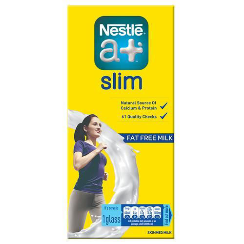 Nestle a+ Slim Milk is a step towards keeping fit and looking great. Choosing a low-fat diet and physical activities like taking the stairs, jogging and cycling can help meet your fitness goal. Enjoy the delicious low-fat Slim Milk with 0.2% fat in every glass (1 glass = 200ml). Including low-fat products in your daily diet can help maintain your calorie intake. Nestle Slim Milk has the same goodness of regular milk with 95% less fat *as compared to cow or buffalo milk.